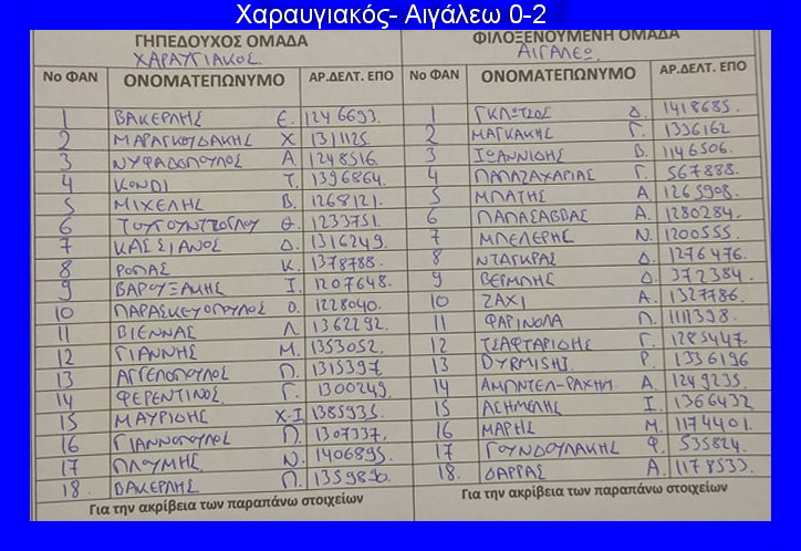 ΑΙΓΑΛΕΩ: Γκλώτσος, Μαγκάκης, Ιωαννίδης, Παπαζαχαρίας, Μπατής, Παπασάβας, Μπελέρης, Ντάγκρας, Βέρμπης, Ζάχι, Φαρινόλα