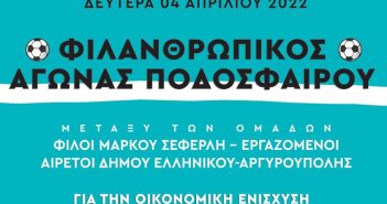 Παίζουμε για την Όλγα» Δευτέρα 4 Απριλίου 2022«, στις 18:00 Α’ Δημοτικό Στάδιο Αργυρούπολης «Γιώργος Κοσικίδης» Φιλανθρωπικός αγώνας ποδοσφαίρου με…