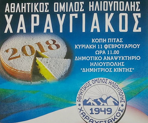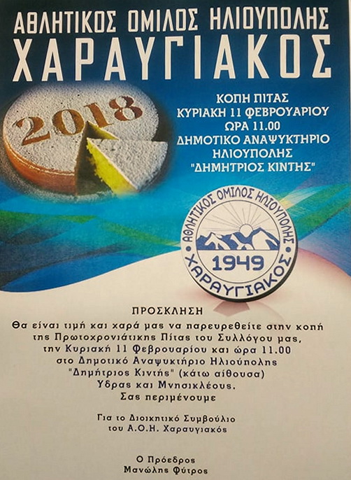 Α Ο ΧΑΡΑΥΓΙΑΚΟΣ ΚΟΠΗ ΒΑΣΙΛΟΠΙΤΑΣ 2018 ΚΥΡΙΑΚΗ 11 ΦΕΒΡΟΥΑΡΙΟΥ ΩΡΑ:11πμ ΔΗΜ.ΑΝΑΨΥΚΤΙΡΙΟ ΗΛΙΟΥΠΟΛΗΣ .