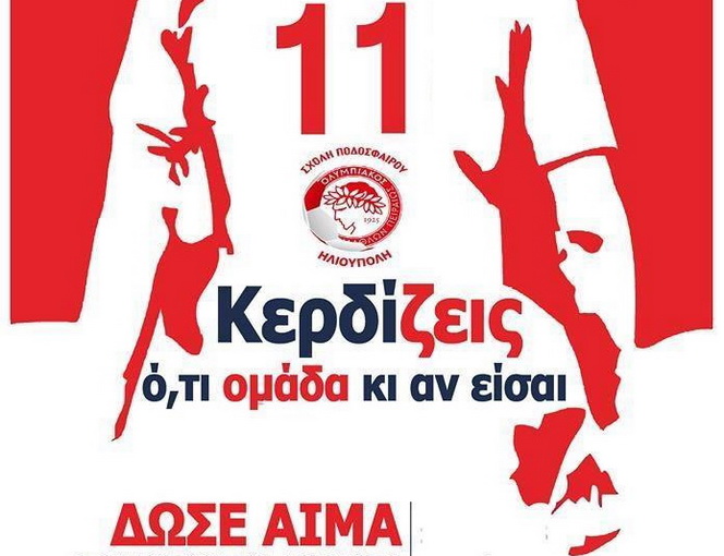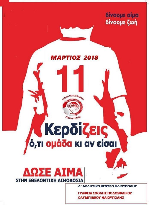 ΚΥΡΙΑΚΗ 11 ΜΑΡΤΙΟΥ 2018 -Δ’ ΑΘΛΗΤΙΚΟ ΚΕΝΤΡΟ ΗΛΙΟΥΠΟΛΗΣ. ΣΥΜΜΕΤΕΧΟΥΜΕ ΟΛΟΙ ΣΤΟΝ ΑΓΩΝΑ .ΔΙΝΟΥΜΕ ΑΙΜΑ – ΔΙΝΟΥΜΕ ΖΩΗ. ΕΝΑΣ ΑΓΩΝΑΣ ΠΟΥ ΕΧΕΙ ΜΟΝΟ ΝΙΚΗΤΕΣ . ΔΗΛΩΣΕ ΚΑΙ ΕΣΥ ΣΥΜΜΕΤΟΧΗ ,ΦΕΡΕ ΚΑΙ ΤΟ ΦΙΛΟ ΣΟΥ ΚΑΙ ΤΟ ΓΝΩΣΤΟ ΣΟΥ ,ΟΛΟΙ ΧΩΡΑΜΕ ΣΤΗΝ ΟΜΑΔΑ. ΔΙΟΡΓΑΝΩΤΗΣ ΣΧΟΛΗ ΠΟΔΟΣΦΑΙΡΟΥ ΟΛΥΜΠΙΑΚΟΥ ΗΛΙΟΥΠΟΛΗΣ