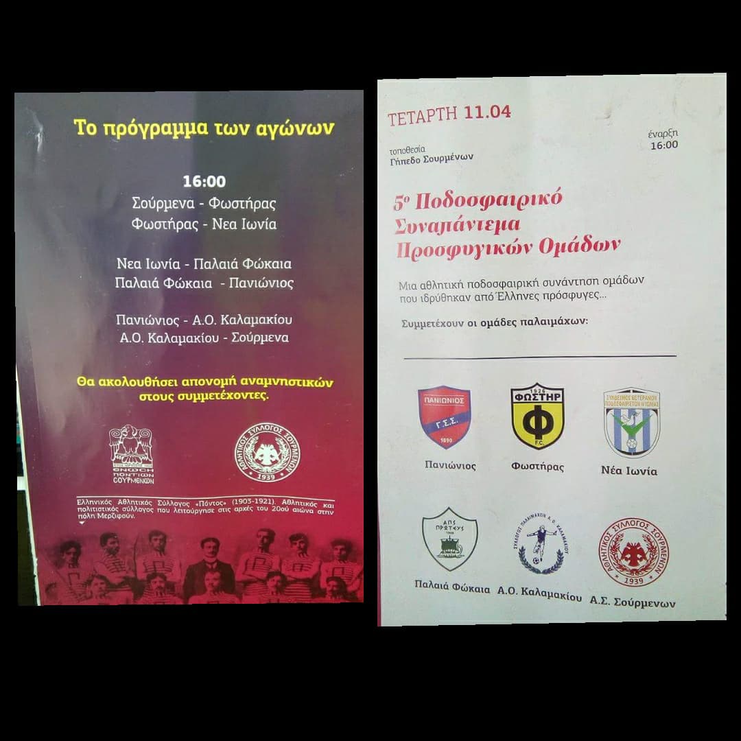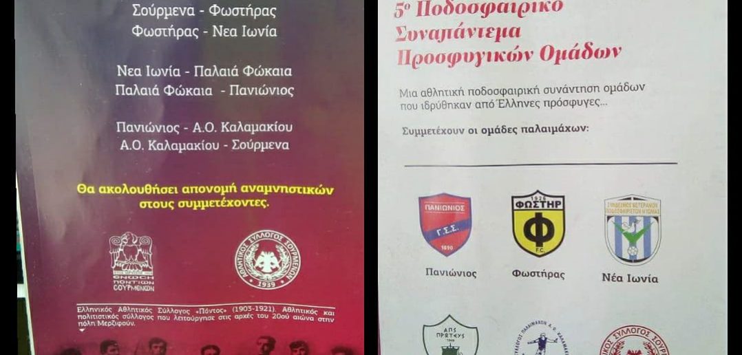Ο Α.Σ.ΣΟΥΡΜΕΝΑ διοργανώνει στις 11 Απριλίου 2018 στις 16:00 μμ στο γήπεδο “Ελληνικού” για 5η συνεχή χρονιά το ισάριθμο ποδοσφαιρικό συναπάντεμα της προσφυγιάς.
