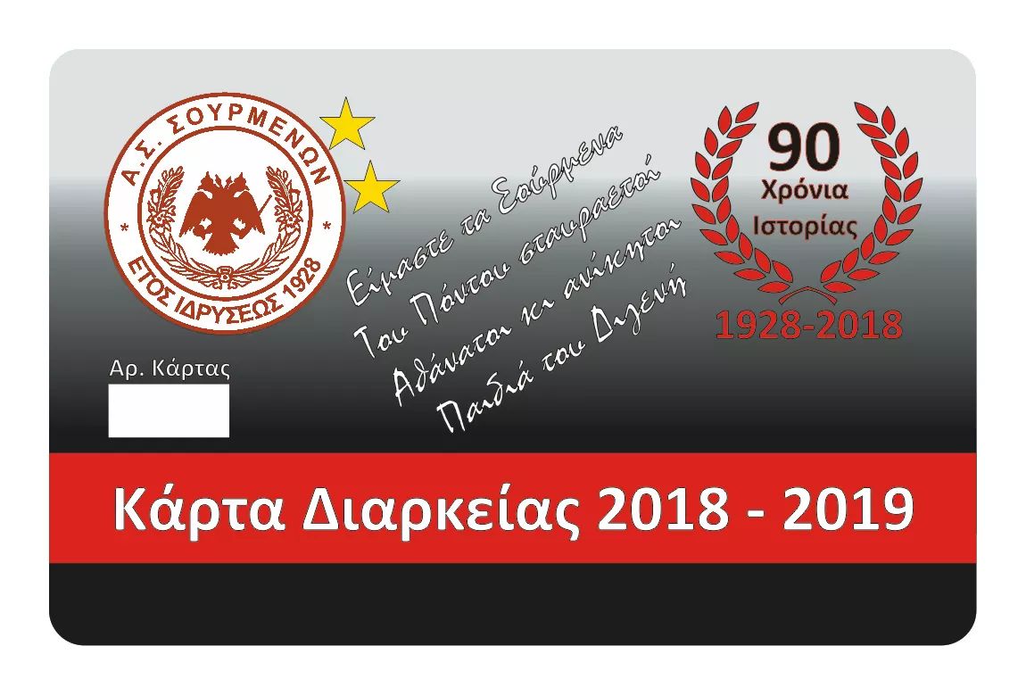Το ΔΣ του Α.Σ. Σουρμένων ενημερώνει τους φιλάθλους πως ξεκίνησε η διάθεση των Συλλεκτικών- Επετειακών Καρτών Διαρκείας της σεζόν 2018-2019 που είναι αφιερωμένες στα 90 χρόνια του συλλόγου μας.