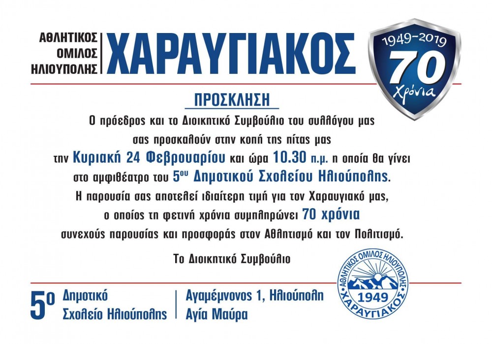 Την Κυριακή 24 Φεβρουαρίου θα πραγματοποιηθεί η κοπή πίτας του Χαραυγιακού. *”70 χρόνια Χαραυγιακος”