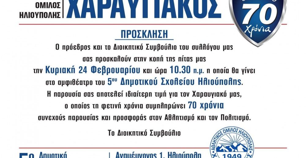 Την Κυριακή 24 Φεβρουαρίου θα πραγματοποιηθεί η κοπή πίτας του Χαραυγιακού. *”70 χρόνια Χαραυγιακος”
