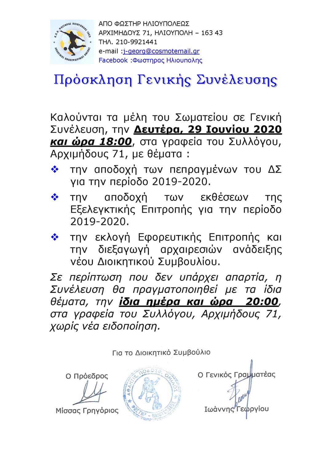 Δευτέρα 29 Ιουνίου Γενική Συνέλευση ο Φωστήρας Ηλιούπολης.