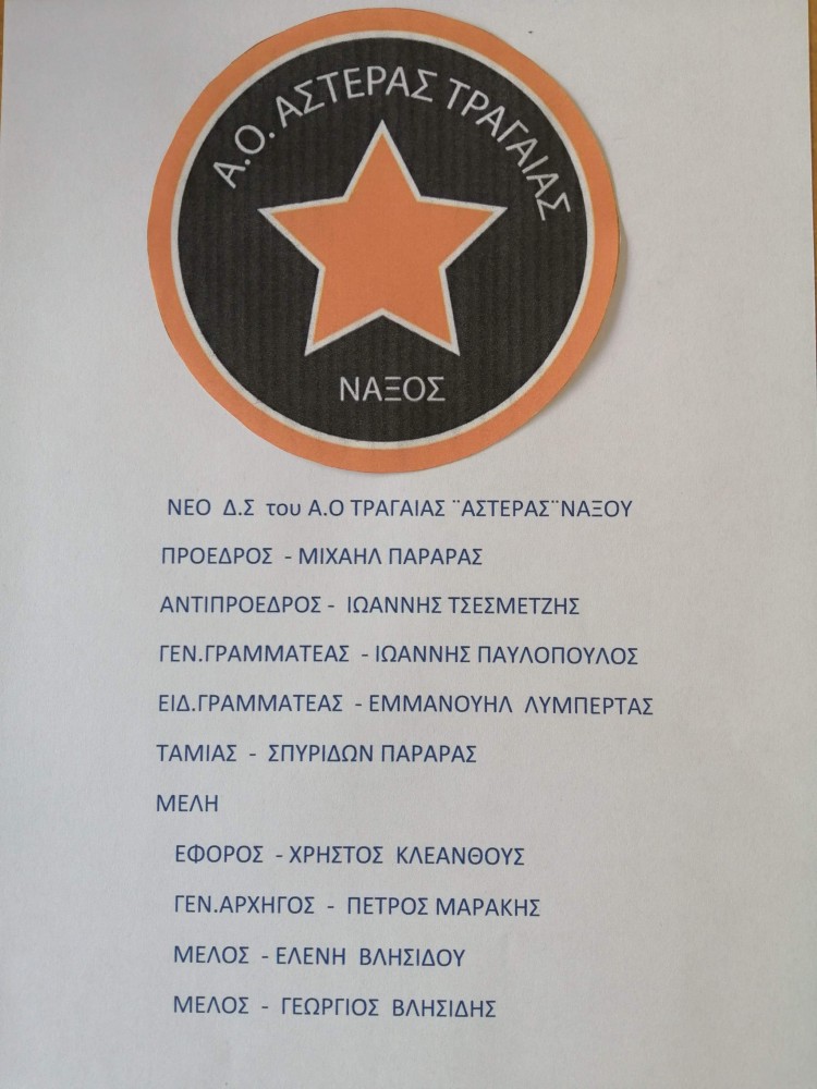 Συγκροτήθηκε σε σώμα η νέα διοίκηση της κυκλαδίτικης ομάδας Αστέρας Τραγαίας Νάξου.