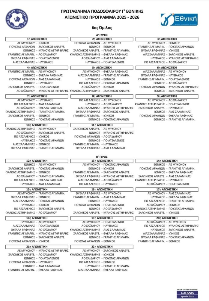 Το Πρόγραμμα της Γ’ εθνικής 6ος όμιλος 2025-26