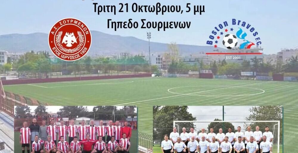 📌 Σήμερα Τρίτη 21 Οκτωβρίου 2025, στις 17:00, θα πραγματοποιηθεί στο γήπεδο Σουρμένων «Κ. Κορτζίδης» ένας ξεχωριστός διεθνής φιλικός αγώνας ανάμεσα στους παλαίμαχους του Αθλητικού μας Συλλόγου και της ομάδας Boston Braves FC που αποτελείται από Έλληνες της Ομογένειας στις Η.Π.Α.