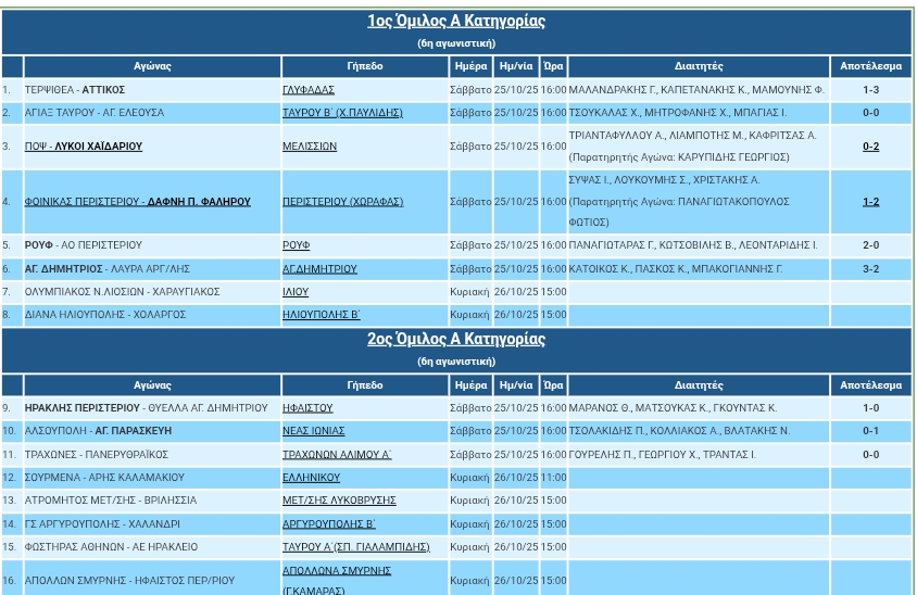 Πρόγραμμα Α’ κατηγορίας ΕΠΣΑ 25,26/10/25