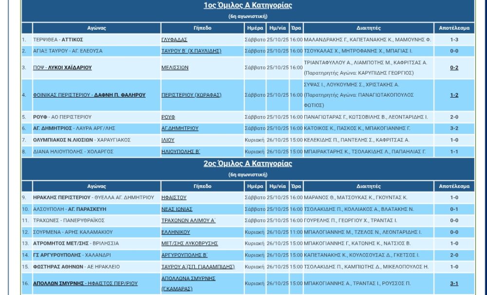 Τα αποτελέσματα Α’ ΕΠΣΑ 25,26/10/25