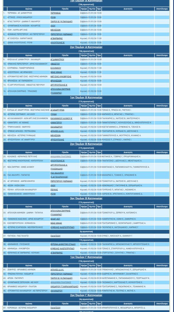 Το πρόγραμμα της ΕΠΣΑ του Σαββάτου 31/01/26