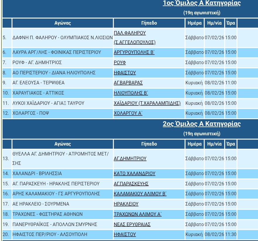 Το πρόγραμμα της ΕΠΣΑ Α’ κατηγορίας 07,08/02/26
