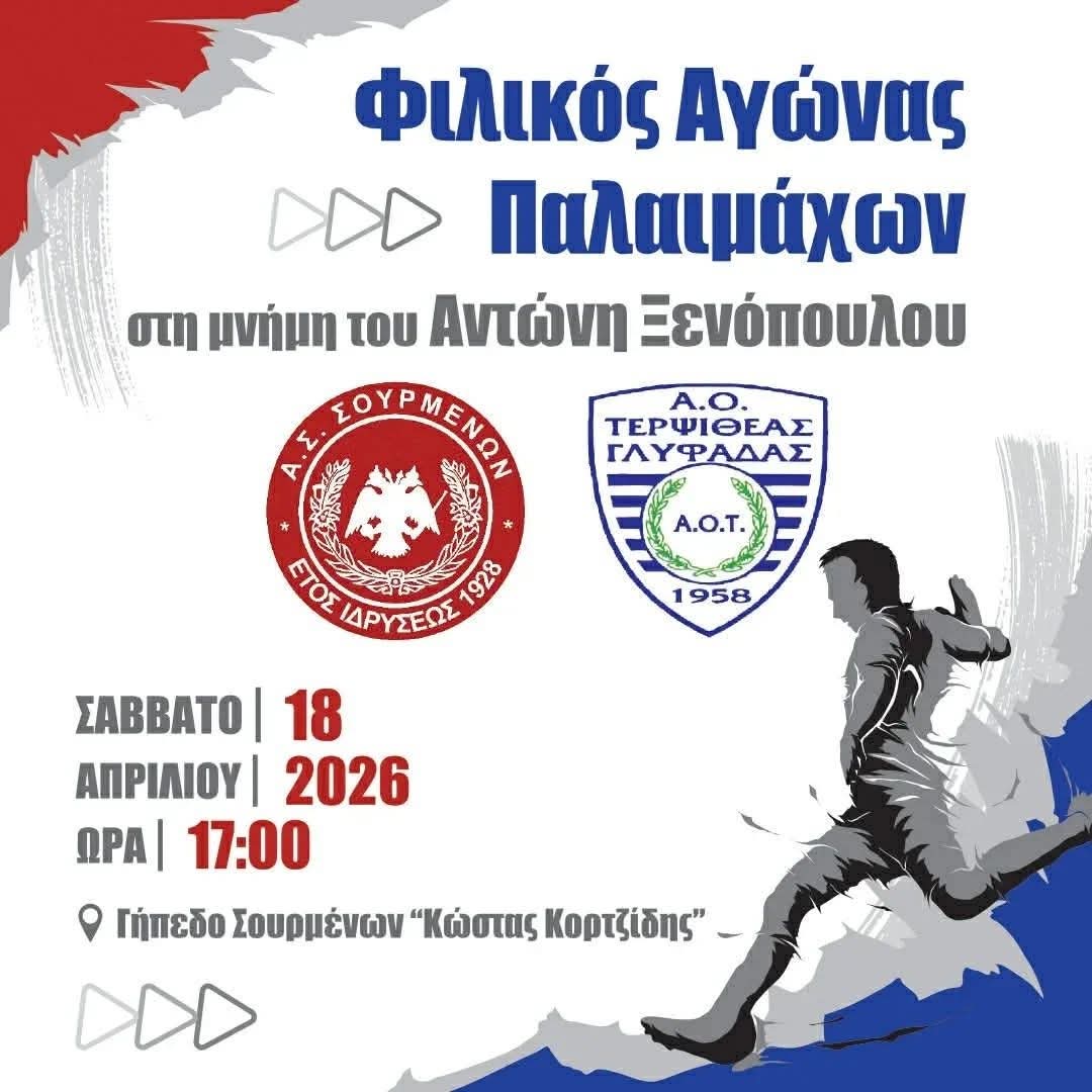 Ένας αγώνας παλαιμάχων εις μνήμη του Αντώνη Ξενόπουλου , μεταξύ Παλαιμάχων Σουρμένων – Τερψιθέας 18/04/26 ώρα 17:00 Γήπεδο Ελληνικού (Κώστας Κορτζίδης) Αναλυτικά :