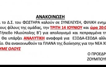 Φωστήρας Ηλιούπολης. Γενική συνέλευση Τρίτη 14 Ιουνίου.