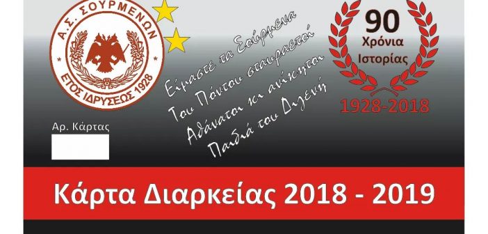 Το ΔΣ του Α.Σ. Σουρμένων ενημερώνει τους φιλάθλους πως ξεκίνησε η διάθεση των Συλλεκτικών- Επετειακών Καρτών Διαρκείας της σεζόν 2018-2019 που είναι αφιερωμένες στα 90 χρόνια του συλλόγου μας. Προμηθευτείτε έγκαιρα την Κάρτα Διαρκείας του Α.Σ. Σουρμένων και εξασφαλίστε δωρεάν είσοδο στους εντός έδρας αγώνες της ομάδας μας για το Πρωτάθλημα Α΄ Κατηγορίας της Ε.Π.Σ. Αθηνών και το Κύπελλο Ελλάδος Ερασιτεχνών. Σας περιμένουμε όλους να τιμήσετε την ιστορία του συλλόγου μας και να στηρίξετε την προσπάθεια της ανανεωμένης ομάδας μας! Σημεία διάθεσης: • Γραμματεία Α.Σ. Σουρμένων, γήπεδο Ελληνικού (25ης & Αγ. Τριάδας, τηλ. 2109626012) Δευτέρα-Παρασκευή 19:00 – 21:00 • NON…