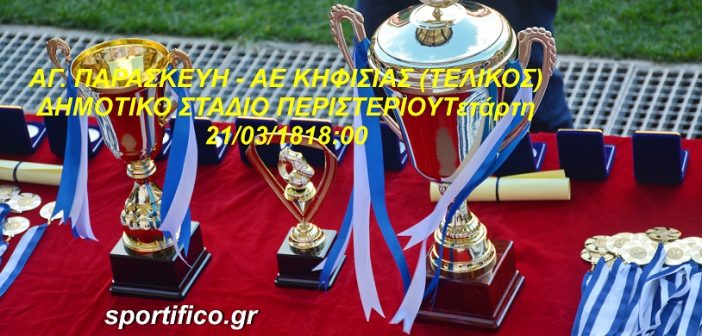 Την Τετάρτη είναι ο τελικός κυπέλλου ΕΠΣΑ στο γήπεδο του Ατρόμητου Περιστερίου στις 18.00 μμ. ΑΓ. ΠΑΡΑΣΚΕΥΗ – ΑΕ ΚΗΦΙΣΙΑΣ (ΤΕΛΙΚΟΣ) ΔΗΜΟΤΙΚΟ ΣΤΑΔΙΟ ΠΕΡΙΣΤΕΡΙΟΥ Τετάρτη 21/03/18 18:00 μμ