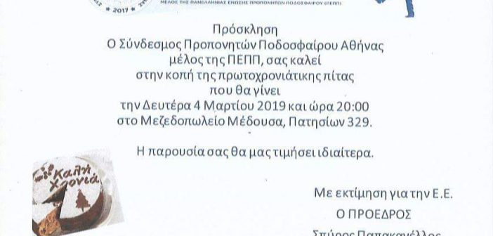 Την Δευτέρα 04-03-2019 ο Συνδυασμός Προπονητών Ποδοσφαίρου Αθήνας, κόβει την πίτα. Ώρα 20:00 Μεζεδοπωλείο η Μέδουσα Πατησίων 329.